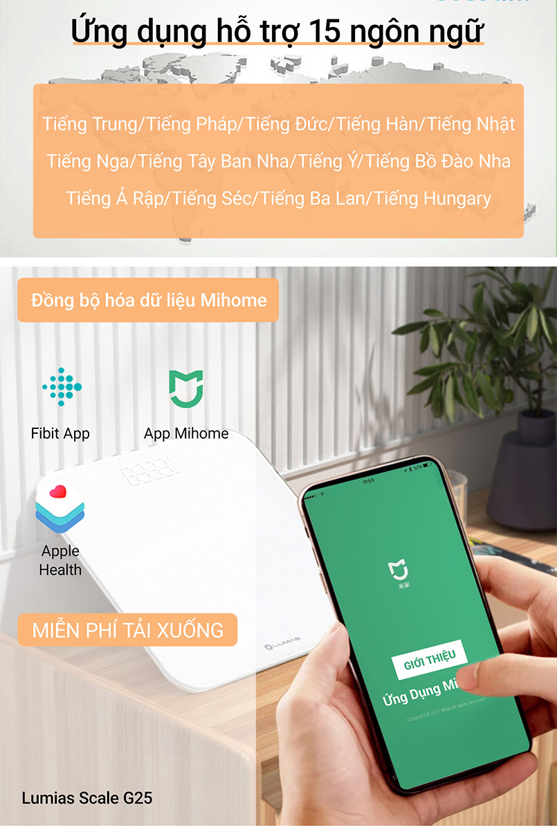 Cân điện tử Lumias Scale G25 có màn hình LED ẩn cao cấp hiển thị rõ ràng các chỉ số đo lường, sử dụng 3 viên pin AAA 1.5V, dễ dàng thay thế khi cần thiết. Công nghệ Step-On cho phép cân tự động bật khi bạn bước lên, tự động tắt sau 30 giây không sử dụng. Cảm biến tiên tiến 2.0 có độ chính xác cao, đo lường sự thay đổi trọng lượng tối thiểu 0.05kg. Đặc biệt, Lumias Scale G25 kết nối với ứng dụng MiHome qua Bluetooth, cho phép đồng bộ hóa dữ liệu, theo dõi lịch sử đo lường và các chỉ số sức khỏe khác.