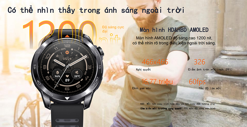 Màn hình 1.43 inch Amoled 466*466, độ sáng tối đa 1200nits