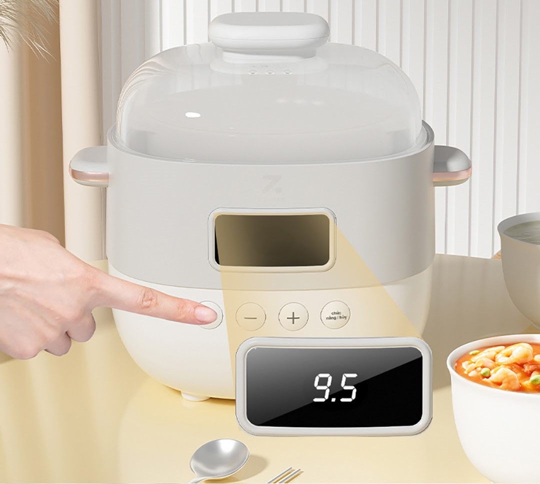 Nồi chưng cách thủy ZOLELE ES101 còn được trang bị chức năng hẹn giờ 9.5 giờ để người dùng có thể sử dụng và cài đặt giờ nấu cho các món ăn nhanh chóng hơn. Đồng thời, bạn có thể dễ dàng cho nguyên liệu vào nồi vào tối hôm trước và cài đặt giờ nấu để có được món ngon dinh dưỡng vào bữa sáng hôm sau.