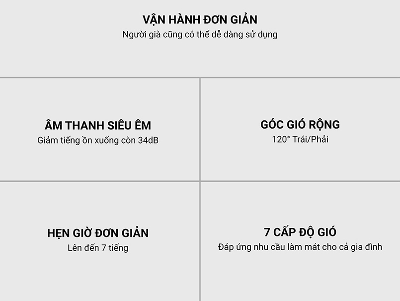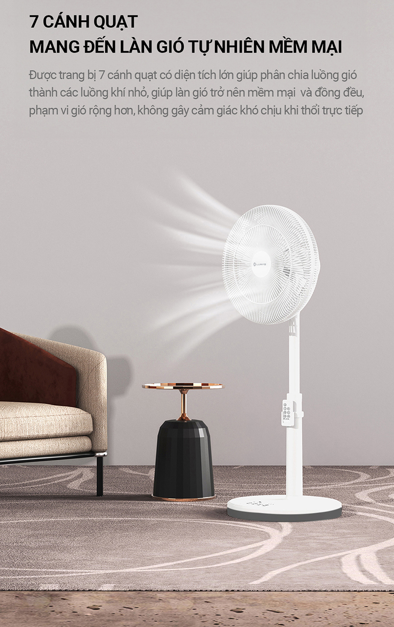 Nổi bật với thiết kế 7 cánh quạt đường kính lớn, một cải tiến thông minh mang đến làn gió mát mẻ hoàn toàn khác biệt. Thay vì một luồng gió mạnh thổi trực diện, thiết kế này phân chia luồng gió thành nhiều luồng khí nhỏ, tạo ra một làn gió nhẹ nhàng, trải đều khắp không gian, mang lại cảm giác dễ chịu như gió tự nhiên, không gây khó chịu khi sử dụng lâu. Quạt điện Lumias F08E không chỉ làm mát hiệu quả mà còn tạo nên một không gian sống thư thái hơn.