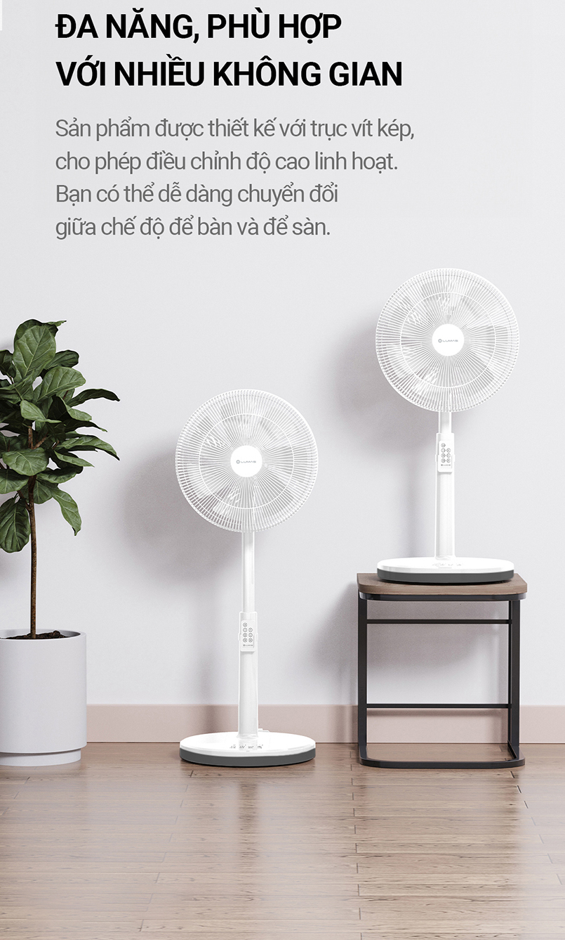 Bên cạnh khả năng làm mát hiệu quả, quạt cây Lumias F08E còn chinh phục người dùng bởi thiết kế vô cùng linh hoạt. Nhờ trục vít kép thông minh, bạn có thể dễ dàng điều chỉnh chiều cao của quạt một cách nhanh chóng, chuyển đổi thành quạt để bàn hoặc quạt đứng tùy theo nhu cầu và không gian sử dụng, phù hợp từ phòng khách, phòng ngủ đến văn phòng làm việc. Thiết kế đa năng và vẻ đẹp hiện đại vừa mang lại sự tiện lợi tối đa, vừa giúp quạt trở thành một điểm nhấn trang trí tinh tế cho ngôi nhà.