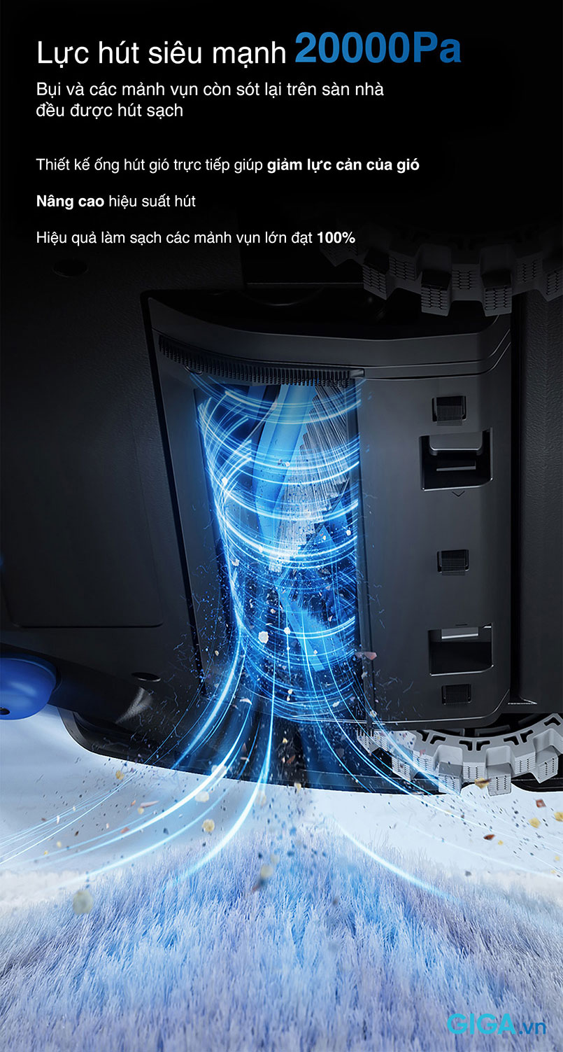 Lực hút mạnh mẽ 20000Pa mang đến hiệu quả làm sạch sâu trên mọi bề mặt