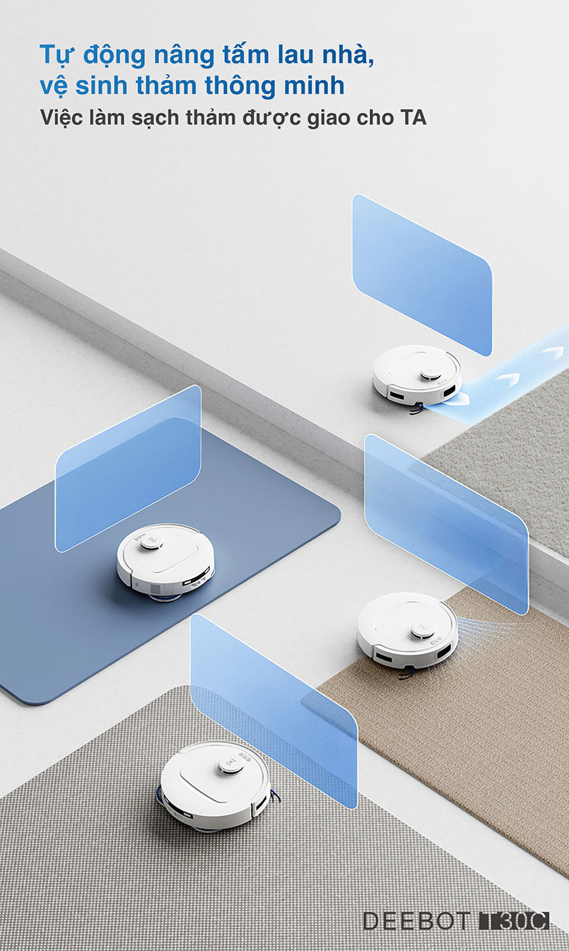 Bên cạnh đó, robot lau nhà Ecovacs Deebot T30C còn có thể tự động nhận biết các loại thảm khác nhau. Dựa vào đó, tự động chọn chế độ làm sạch phù hợp nhất, ví dụ như chỉ hút bụi, không đi vào, chỉ đi lướt qua hoặc chỉ lau sàn ở những khu vực khác. Điều này giúp robot vệ sinh thảm của bạn một cách chuyên nghiệp và hiệu quả nhất, đặc biệt thích hợp với các gia đình sử dụng nhiều thảm.