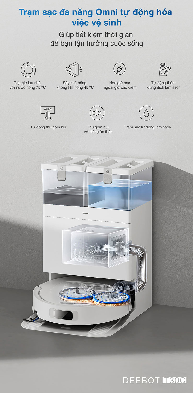 Trạm Omni đa năng của Deebot T30C mang đến sự tiện lợi tối đa, tích hợp mọi thứ bạn cần cho trải nghiệm làm sạch hoàn toàn rảnh tay. Trạm có khả năng tự động thu gom bụi, tự động giặt và sấy khô giẻ lau, tự động thêm dung dịch tẩy rửa, có bình chứa nước lớn 4L và còn cho phép bạn hẹn giờ sạc vào thời điểm điện thấp điểm. Đặc biệt, túi đựng bụi dung tích lớn 3L có thể chứa bụi lên đến 90 ngày, giúp bạn tiết kiệm thời gian và công sức cho việc dọn dẹp.