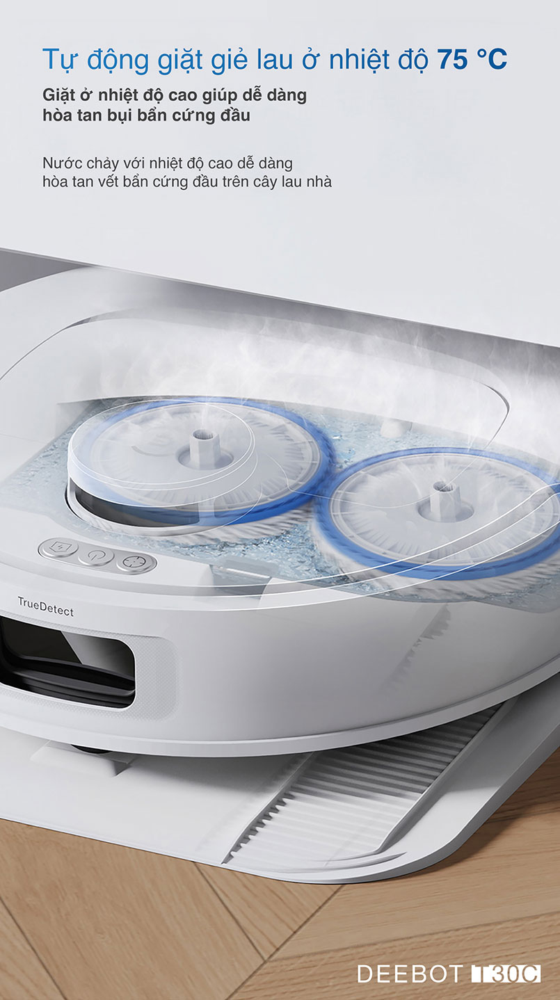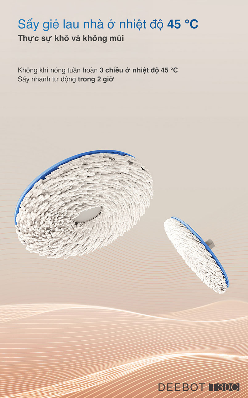 Tính năng tự động làm sạch giúp bạn không cần lo lắng về việc giặt giẻ lau thủ công. Robot sẽ sử dụng các lưỡi cạo đặc biệt trong một khoang riêng để làm sạch giẻ lau. Kết hợp cùng nước nóng 75°C hòa tan bụi bẩn và các vết dầu mỡ cứng đầu. Tiếp theo, giẻ lau sẽ được sấy khô bằng khí nóng 45°C cho đến khi khô hoàn toàn, tránh ẩm mốc và mùi hôi khó chịu, luôn sẵn sàng cho lần sử dụng tiếp theo.