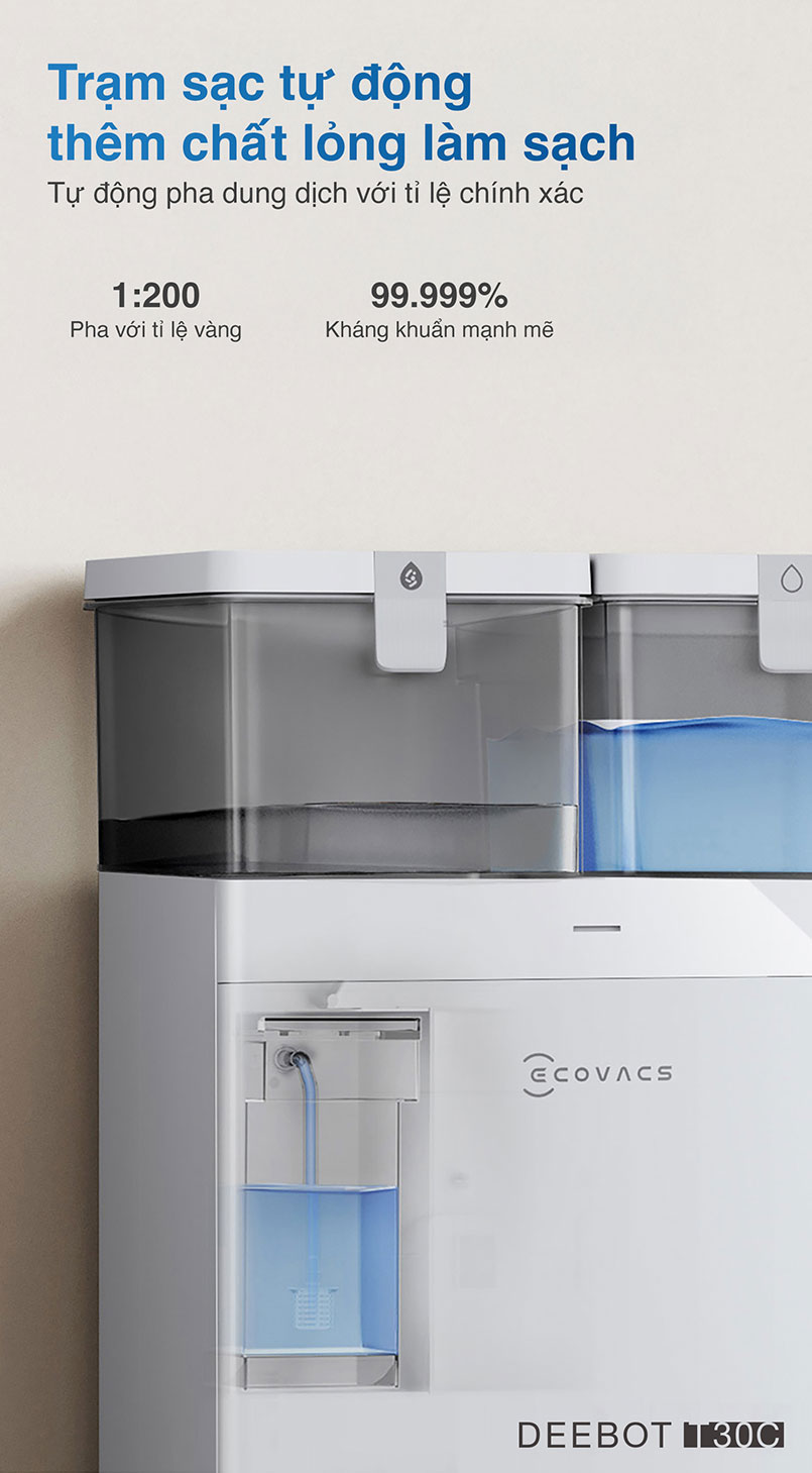 Với khả năng tự động thêm dung dịch làm sạch, Ecovacs T30C giúp bạn tiết kiệm tối đa thời gian và công sức. Robot sẽ tự động pha dung dịch tẩy rửa với nước sạch theo tỉ lệ chuẩn 200:1, loại bỏ hoàn toàn việc bạn phải tự tay thêm dung dịch mỗi lần lau nhà, đồng thời đảm bảo sàn nhà luôn được chăm sóc một cách tốt nhất, kháng khuẩn mạnh mẽ 99.99%.