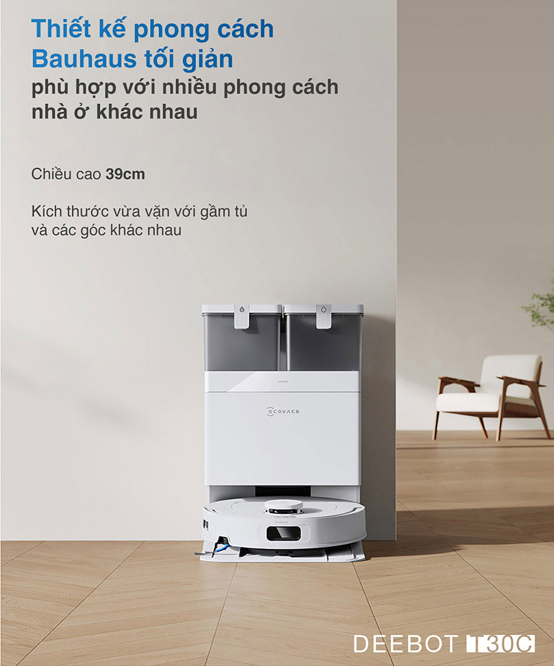 Lấy cảm hứng từ phong cách tối giản, robot Deebot T30C sở hữu ngoại hình tinh tế, sang trọng phù hợp với hầu hết không gian sống hiện đại. Thiết kế này vừa đảm bảo hiệu suất làm sạch tối ưu, vừa giữ được tính thẩm mỹ cho không gian nội thất. Đặc biệt, việc đổ nước bẩn, thêm nước sạch vào bình chứa rất thuận tiện, bạn chỉ cần nâng nhẹ bình lên 5cm, mà không cần phải di chuyển toàn bộ trạm sạc.