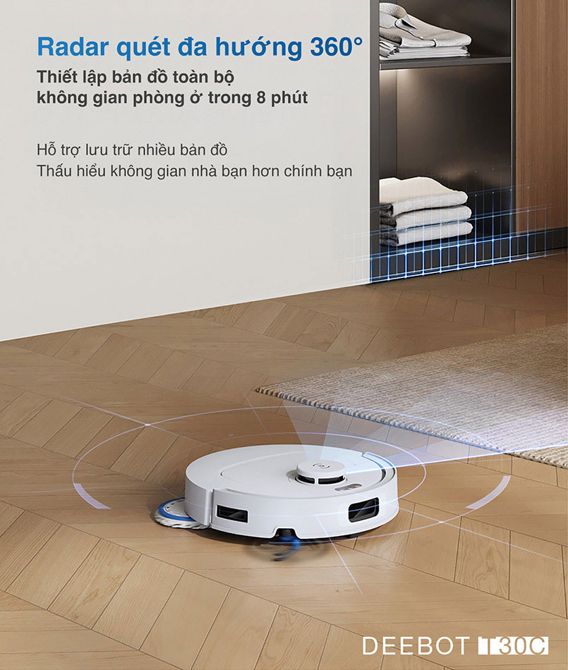 Công nghệ TrueMapping 2.0 quét bản đồ nhanh và thiết lập lộ trình làm sạch thông minh tương ứng với điều kiện môi trường, đảm bảo mọi khu vực đều được làm sạch kỹ lưỡng. Với radar quét đa hướng 360 độ, robot có thể lập bản đồ một khu vực rộng 96m2 chỉ trong 8 phút (Theo kết quả phòng thí nghiệm Ecovacs, thời gian thực tế có thể thay đổi). Công nghệ này còn giúp robot hút bụi Ecovacs Deebot T30C cải thiện khả năng tránh chướng ngại vật và tối ưu lộ tình làm sạch, có thể di chuyển trơn tru trong những khu vực phức tạp như dưới gầm bàn ăn mà không bị mắc kẹt. Với khả năng lưu trữ nhiều bản đồ, người dùng có thể tối ưu hóa cho từng khu vực và robot sẽ tự động chuyển đổi giữa các bản đồ. Ngoài ra, cảm biến chống rơi tự động sẽ bảo vệ robot khỏi nguy cơ rơi cầu thang.
