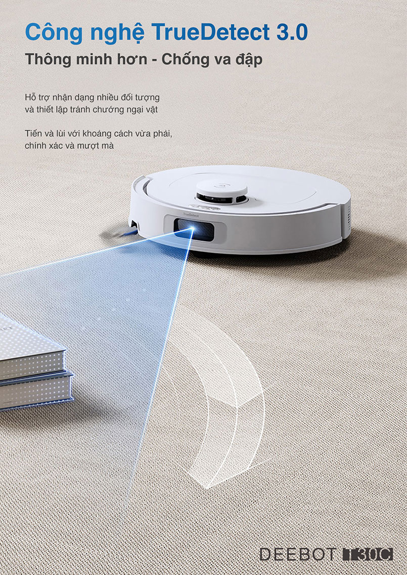 Bên cạnh đó, công nghệ TrueDetect 3.0 đã được nâng cấp, sử dụng ánh sáng có cấu trúc, tia laser hồng ngoại và cảm biến độ sâu để xác định đường viền của vật thể. Nhờ đó có thể quét và nhận diện vật thể một cách chính xác đến từng milimet, tránh chướng ngại vật hiệu quả hơn. Điều này giúp robot hút bụi lau nhà Ecovacs Deebot T30C di chuyển mượt mà, giảm thiểu va chạm, kẹt hoặc vướng víu, đồng thời mở rộng phạm vi làm sạch và đảm bảo an toàn cho ngôi nhà của bạn.