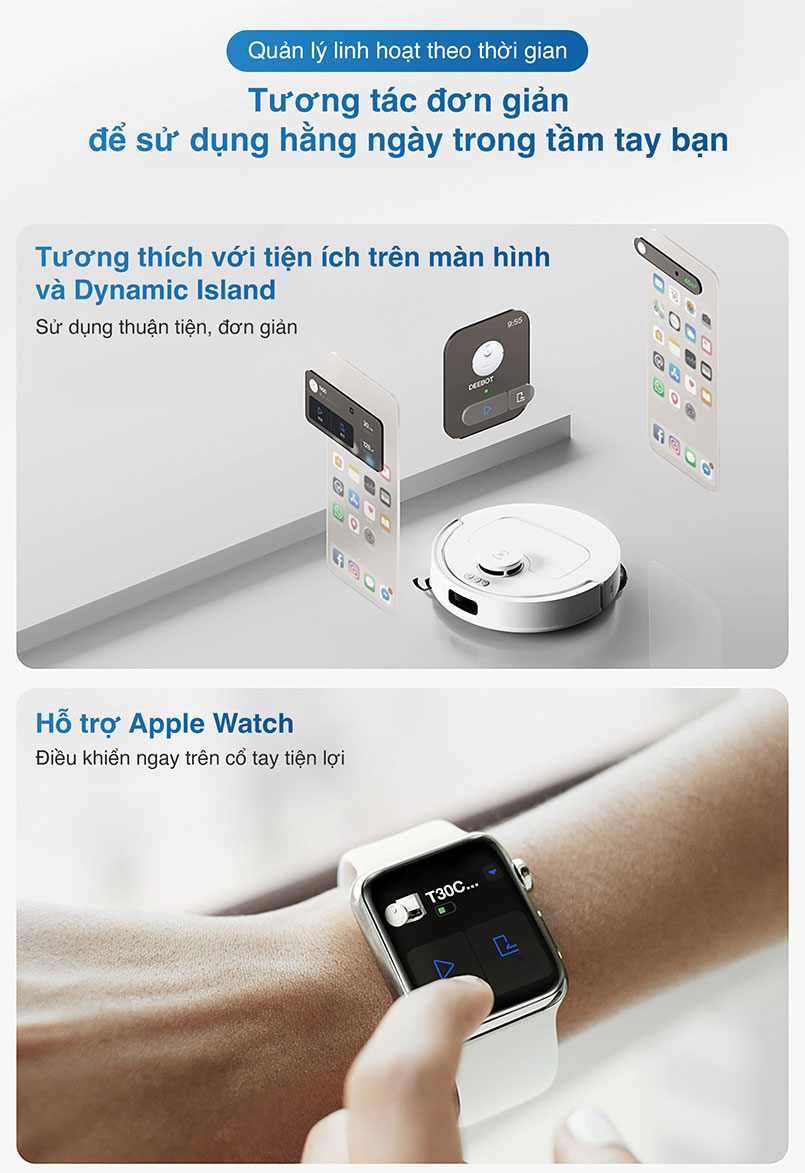 Đặc biệt, người dùng iPhone có thể tận dụng Dynamic Island để xem nhanh trạng thái hoạt động của robot. Khi mở rộng, cho phép bạn thực hiện các thao tác thường dùng một cách thuận tiện nhất. Ngoài ra, nếu bạn sở hữu Apple Watch, bạn cũng có thể theo dõi trạng thái hoạt động hoặc sử dụng các lệnh cơ bản như bắt đầu quá trình làm sạch hoặc yêu cầu robot quay về trạm sạc ngay trên cổ tay.
