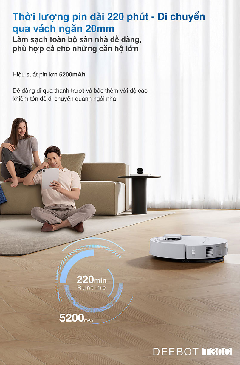 Trang bị viên pin dung lượng lớn 5200mAh hoạt động liên tục đến 220 phút chỉ với 1 lần sạc đầy (Theo kết quả phòng thí nghiệm Ecovac, thời gian làm thực tế có thể thay đổi). Điều này đảm bảo quá trình làm sạch không bị gián đoạn, cho phép robot dọn dẹp một khu vực rộng lớn và không bỏ sót bất kỳ vết bẩn nào, đồng thời giảm số lần bạn cần sạc pin cho robot.